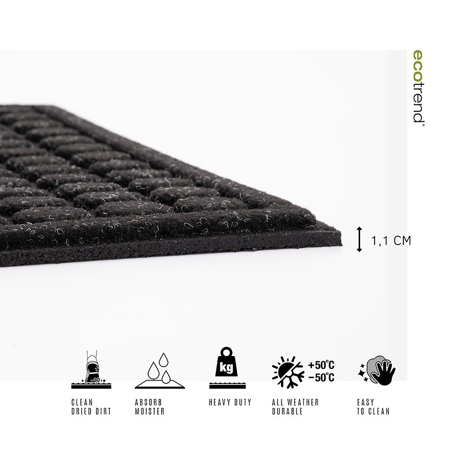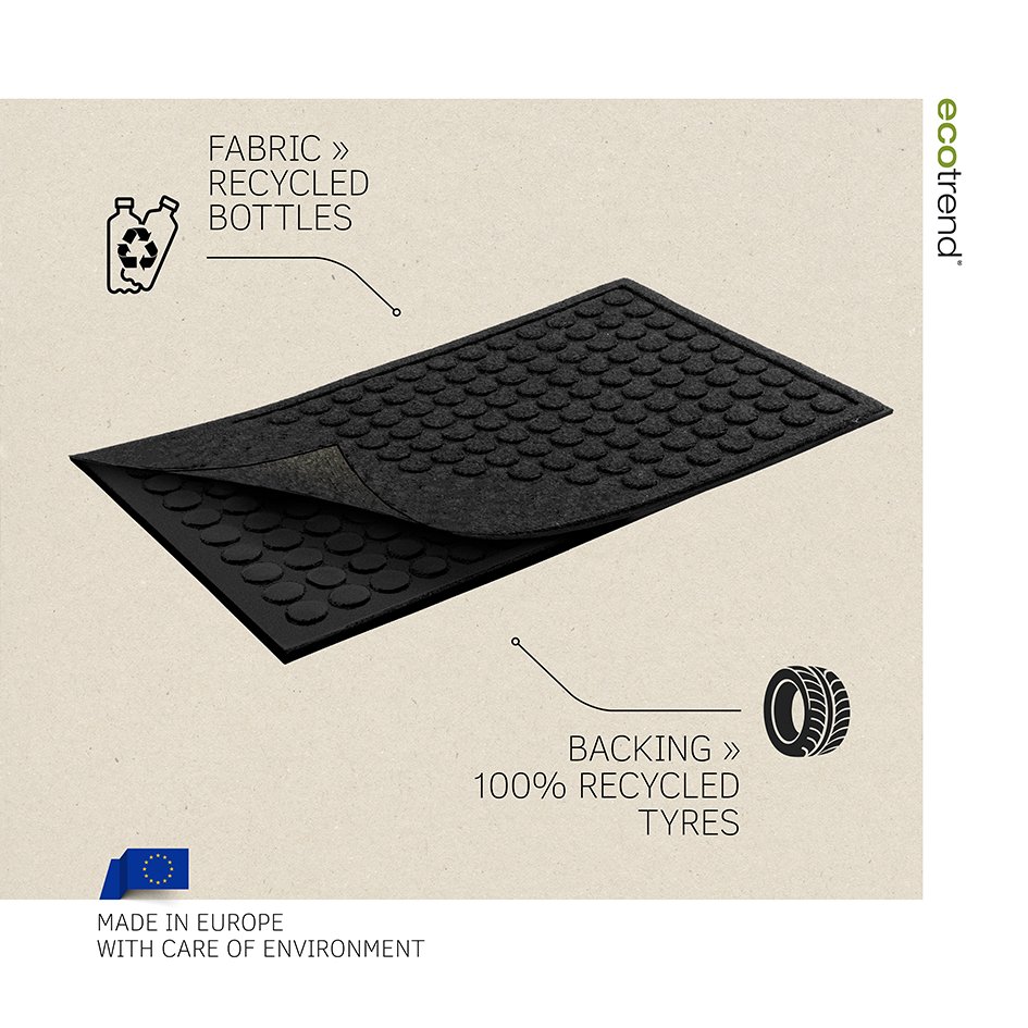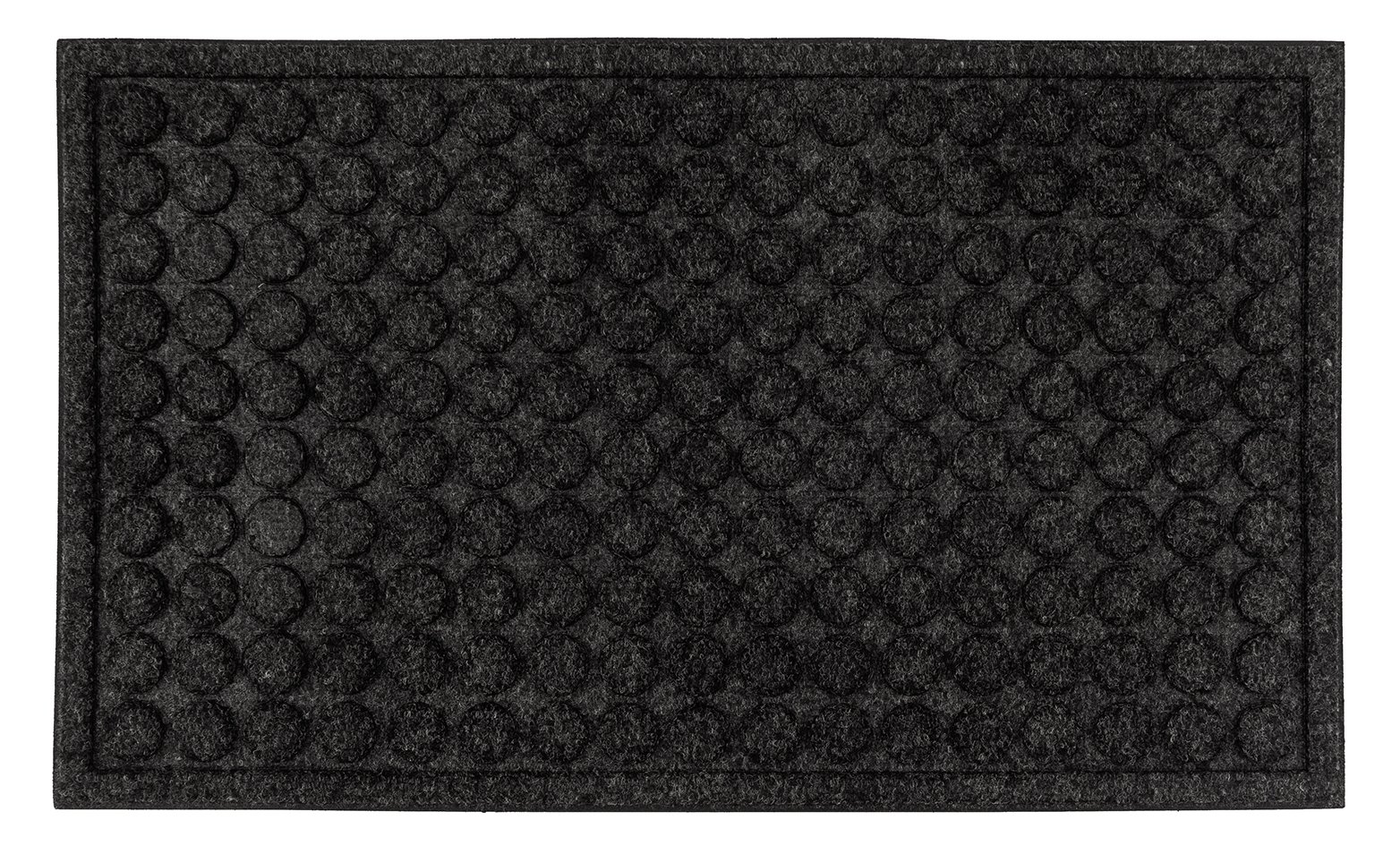 Donja i gornja strana otirača CONTOURS ROUNDS, proizvođača MULTY HOME, napravljene je od recikliranih materijala. Otirač je teška prostirka koju jaki naleti vetra neće oduvati. Površina od kvalitetnog poliestera čini da je ova HEAVY-DUTY vodo-absorbujuća podna prostirka odlična za struganje prljavštine i odstranjivanje krupnijih komadića sa obuće. Idealan je i za unutrašnju i za spoljnu upotrebu u područijma kao što su blatne-prostorije, garaže, ulazi. ECO-FRIENDLY proizvod.