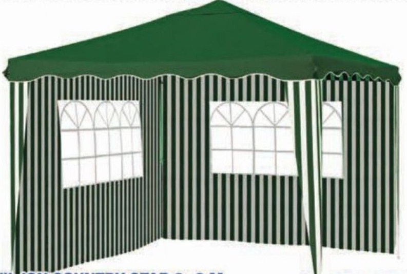 Paviljon dimenzija 3 x 3 x 2.5m idealna je zaštita od sunca ili kiše tokom letnjih dana. Paviljon dolazi sa stranicama koje se mogu urolati ili ukloniti. Ram i rebra su napravljeni od čelika dok je krov od vodootpornog poliestera.