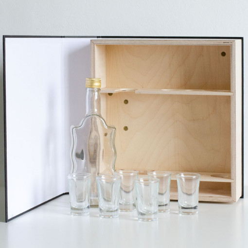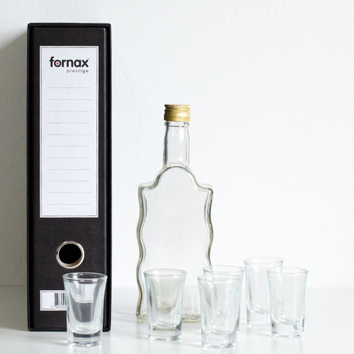 Imate svoj štek za najpotrebniju stvar ako radite u knjigovodstveno administrativnim poslovima. Flaša sa šest čašica u crnom registratoru.