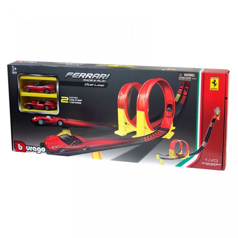 • Burago Ferrari set sadrži stazu za automobile u razmeri 1:43 sa dve paralelne trake i po jednim lupingom na svakoj traci i dve verne replike Ferrari automobila.