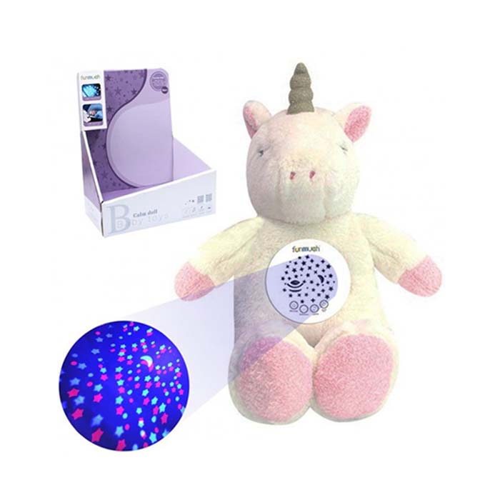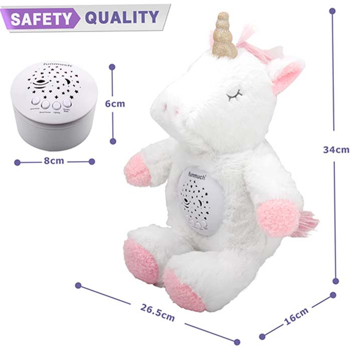 - Na stomaku je projektor koji svetli u različitim bojama, pušta uspavanke, razne zvukove za spavanje