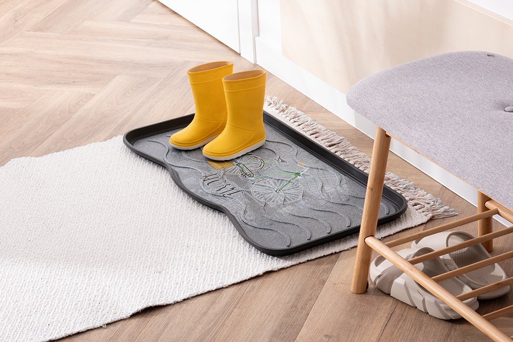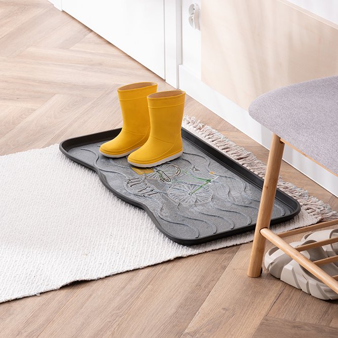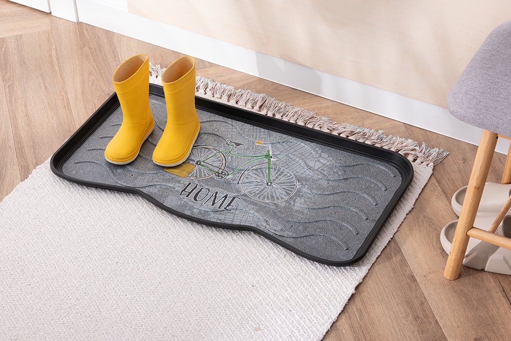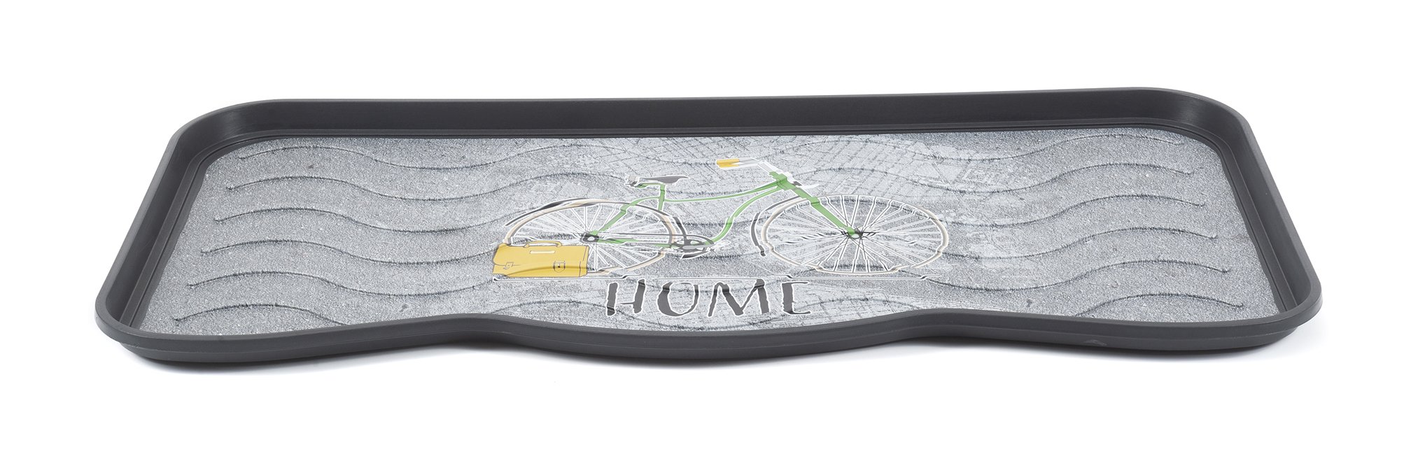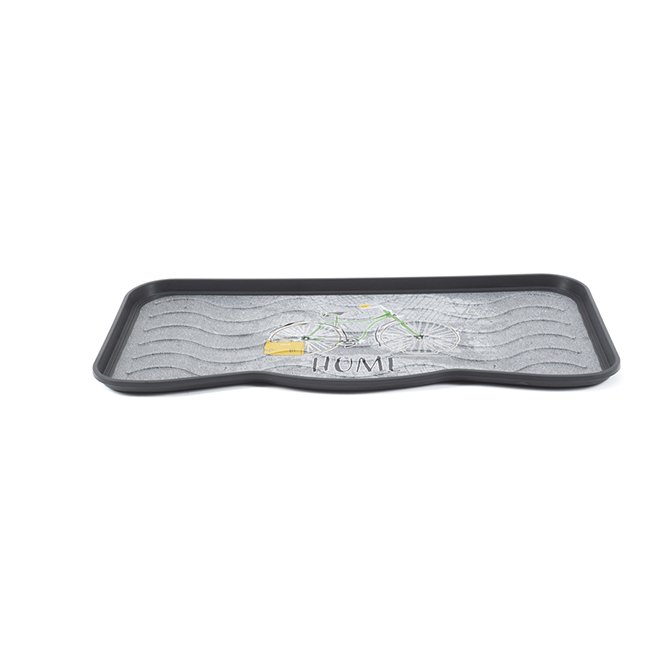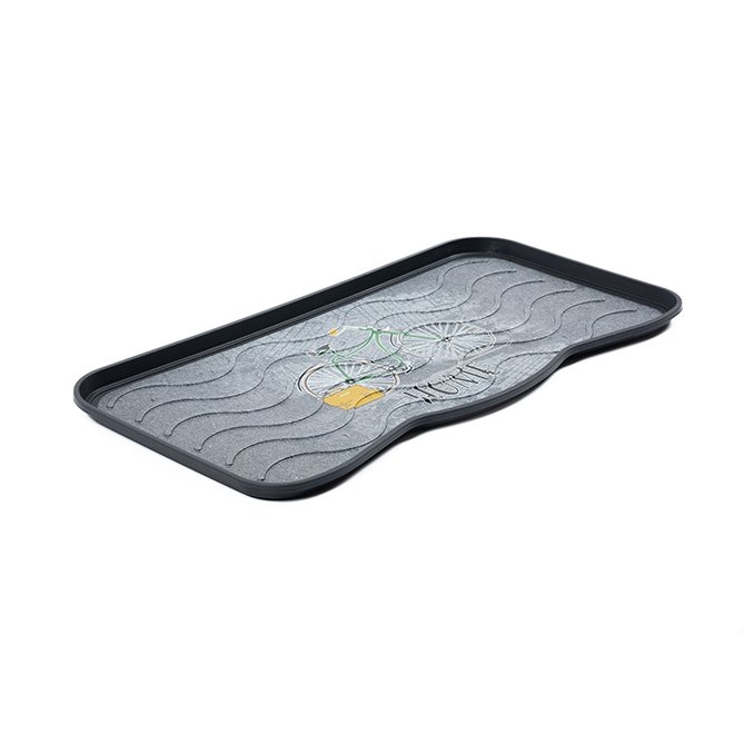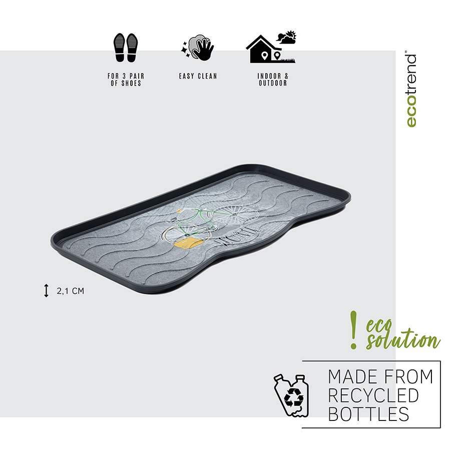 Dekorativna podloga za odlaganje obuće kompanije MULTY HOME - model BICIKL stilski je lepa a u isto vreme veoma izdržljiva. Dizajnirana je da zadrži prljavštinu, vodu, sneg i bljuzgavicu u tacni umesto na podu. Lagano se čisti - jednostavno se ili samo obriše spužvom ili se sapere mlazom vode. Ove (tacne) podloge za obuću su u stvari univerzalne jer se pored urednog odlaganja obuće mogu koristi i kao podmetači za posude za hranu kućnih ljubimaca, saksija za cveće, itd. Dimenzije su joj 75x38x2.1 cm (za 3 para cipela). Materijal - reciklirana plastika. ECO-FRIENDLY proizvod.