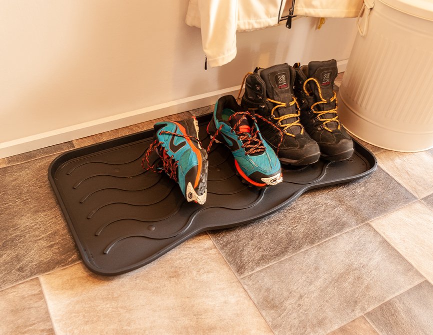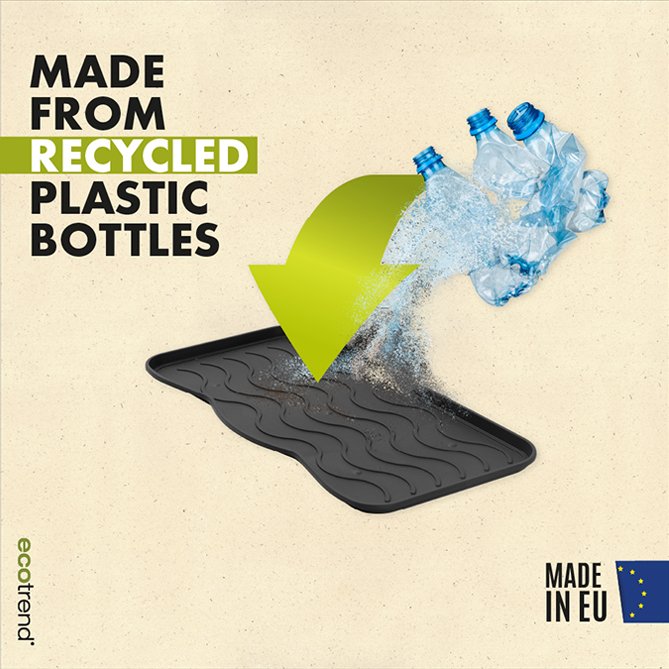 Podloga za odlaganje obuće kompanije MULTY HOME - model SIGNET dizajnirana je da zadrži prljavštinu, vodu, sneg i bljuzgavicu u tacni umesto na podu. Lagano se čisti - jednostavno se ili samo obriše spužvom ili se sapere mlazom vode. Ove (tacne) podloge za obuću su u stvari univerzalne jer se pored urednog odlaganja obuće mogu koristi i kao podmetači za posude za hranu kućnih ljubimaca, saksija za cveće, itd. Dimenzije su joj 75x38x2.1 cm (za 3 para cipela). Materijal - reciklirana plastika. ECO-FRIENDLY proizvod.