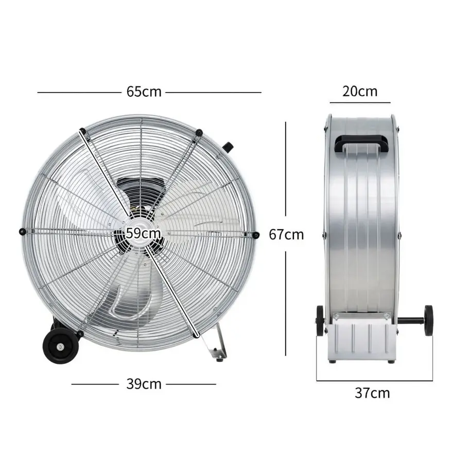 Njegova izdržljiva čelična konstrukcija, aluminijumska sečiva i čelična mreža osiguravaju dugovečnost i sigurnost upotrebe. Pored toga, ventilator se lako pomera zahvaljujući bočnoj ručki i dva gumena točka.