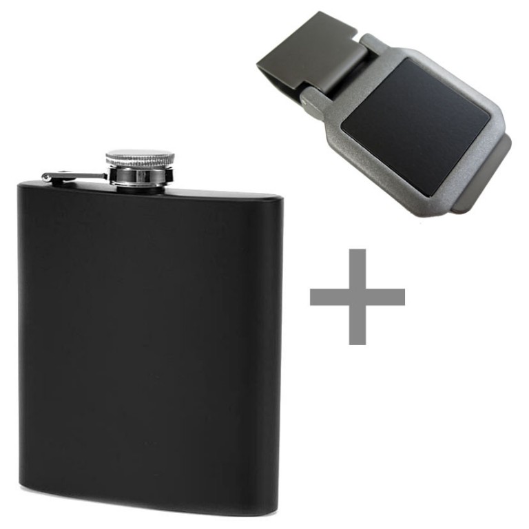 - Poklon set mat crna metalna pljoska zapremine 210ml i štipaljka za papirne novčanice boje hematita. Oba artikla su nezavisno pakovana u crne poklon kutijice, sa mogućnošću da budu upakovane kao set.