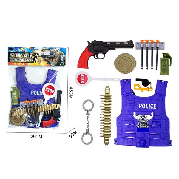 - Set sadrži: pancir, pištolj 4 metkića sa gumenom glavom, STOP palicu, opasač sa neupotrebljivim mecima, lisice, granatu, pištaljku, značku