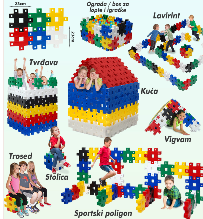 - Deca mogu da kreiraju sa njima bezbroj interesantnih oblika(životinje, robote, vozila. . . ). Takodje big puzzle kocke mogu da se koriste za gradnju kućica za decu, tvrdjavica za decu, malih dečijih vigvam