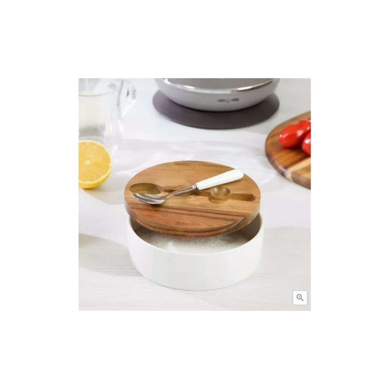 - Kassel KS93557 - Posuda za secer sa kasicicom Bela porcelanska posuda za šećer sa poklopcem od drveta. Set uključuje: - Kašiku sa porcelanskom drškom.