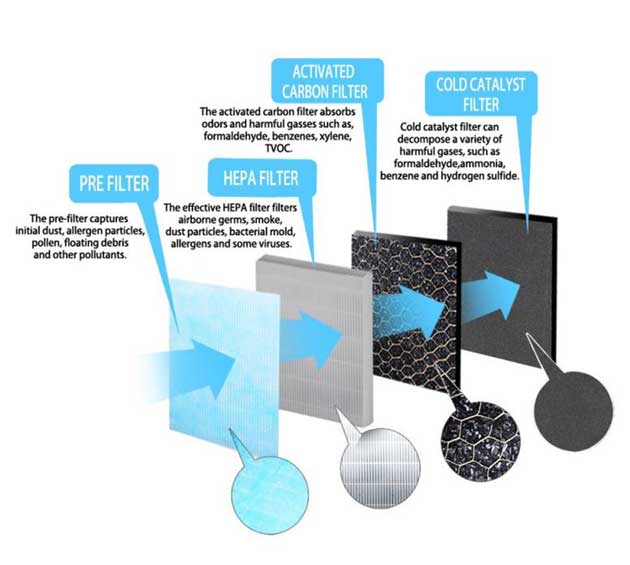 - 4-stepeni filter: predfilter, filter sa aktivnim ugljem, hepa H13 filter i hladan filter katalizatora