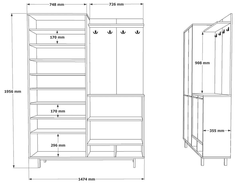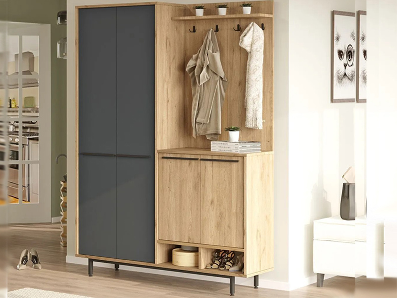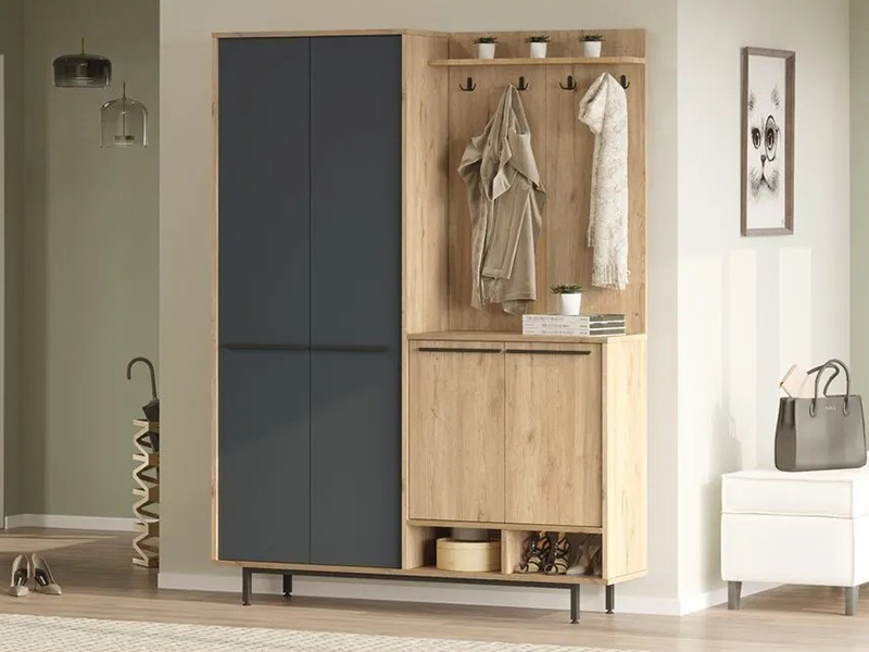 Predsoblje Oasis dezen - antracit metalne noge * Dimenzije : Š:147,4 cm D:35,5 cm V:195,6 cm Predsoblje Oasis dezen - antracit metalne noge izrađeno od kvalitetnog univera 18 mm obloženog melaminskom folijom u drvnom dezenu u kombinaciji sa antracit sivom bojom abs zaštitnom trakom na ivicama,postavljeno na metalne noge. Metalna konstrukcija garantuje nosivost prefarbano je elektrostatičkim premazom otpornim na habanje,noge su štelujuće. Kombinacijom boja ovo predsoblje estetski odgovara svakom kutku uz veliku funkcionalnost i kapacitet za odlaganje obuće. U okvirima E1 standarda materijal ne sadrži kancerogene supstance.