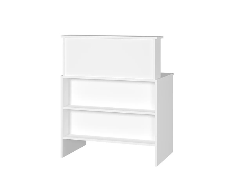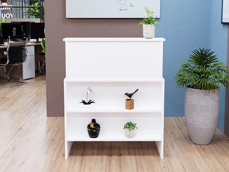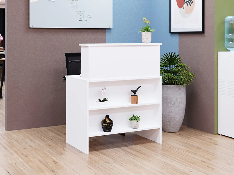 Prijemni pult Venus belo * Dimenzije : Š:90 cm D:58 cm V:110 cm Prijemni pult Venus belo izrađen je od kvalitetne iverice 18 mm obložene melaminskom folijom bele boje,okantovan abs trakom. Sa unutrašnje starne poseduje fioku što mu daje praktičnost,kao i prostor za računar,lap-top. Funkcinalan i lep komad nameštaja,manjih gabarita odgovara svakom prijemnom holu. U okvirima E1 standarda materijal ne sadrži kancerogene supstance i u skladu su sa TSE.