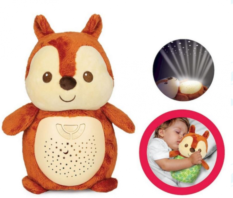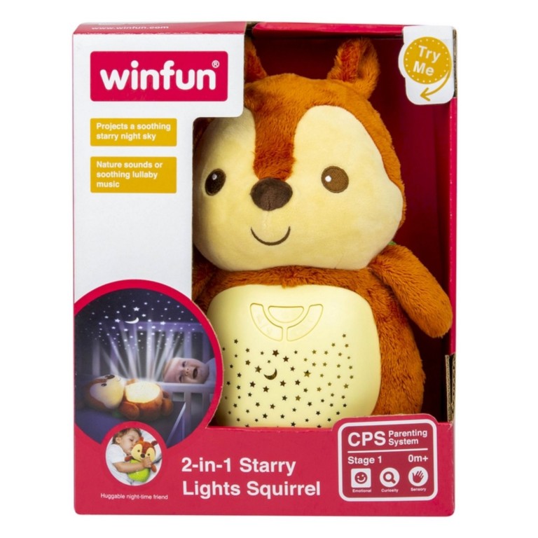 - Win Fun 2u1 projektor veverica kombinacija je maskote s projektorom koja prikazuje sliku zvezdanog neba, a koji dodatno smiruje bebu svirajući uspavanke.