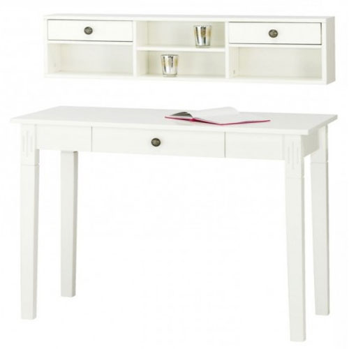 Elegantan radni sto od belo lakiranog drveta sa policom koja se montira na zid gornjim delom.