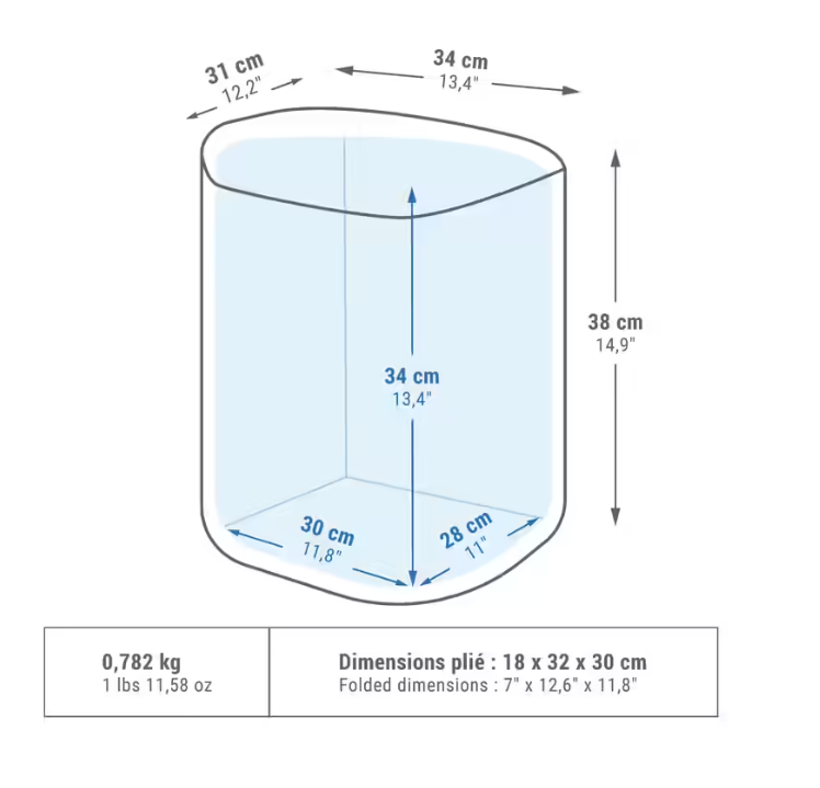 - Visina: 38 cm. Dužina: 34 cm. Širina: 31 cm. Unutrašnje dimenzije: Visina: 34 cm. Dužina: 30 cm. Širina: 28 cm. Kada se sklopi, torba postaje kompaktnija i ima sledeće dimenzije: