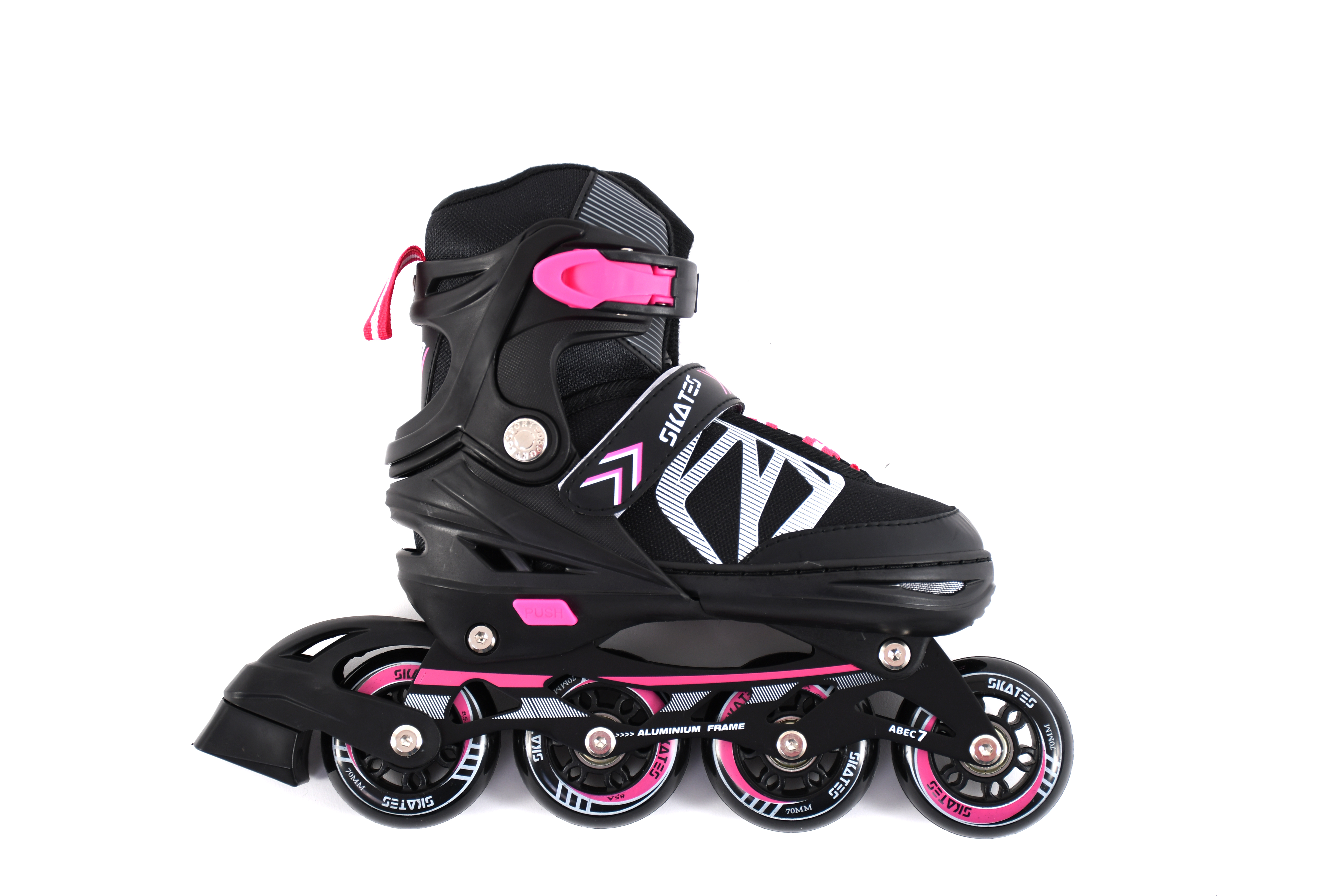 Podesivi roleri namenjeni aktivnoj zabavi svih generacija.Izrađeni od kvalitetne plastike i fabričkog materijala koji se oblikuje prema svakom stopalu. Kvalitetan način osiguranja šavova u procesu proizvodnje šivenjem i lepljenjem osiguravaju dugotrajnost proizvoda. Veličina cipele se podešava do tri broja jednostavnim pritiskom na dugme. Ove rolere karakterišu ABEC-7 lezajevi i alu -šasija koja obezbeđuje kvalitetnu vožnju. Točkovi su izrađeni od poli-uretana što obezbeđuje dinamičnu vožnju bez mnogo buke. Ovaj model je dostupan u BLACK-PINK kombinaciji boja i veličini EU br.35-38.