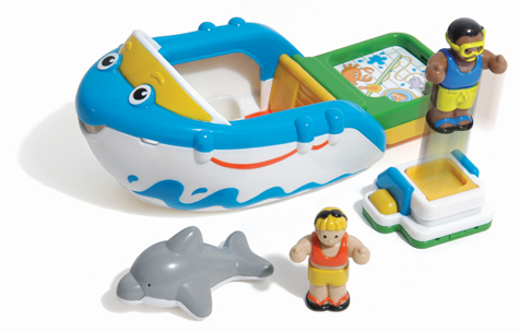 - Ovaj set iz 5 delova sjajan je za kupanje u kadi kao i za igru na suvom. Krov brodića se otvata i unutra se nalazi daska za ronjenje i tajna kabinu. U set su uključene dve figure ljudi i figura delfina.