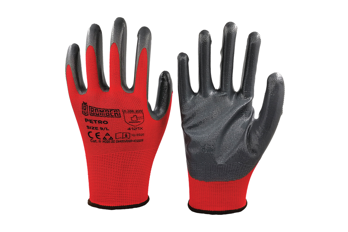 Pletene rukavice od crvenog poliestera, presvučene na dlanu slojem glatkog sivog nitrila. Otporne su na gorivo, ulje. - Veličina: 11 Brend: Bomber
