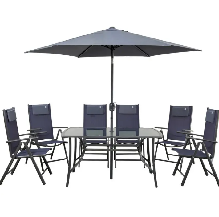 - Baštenska garnitura ili terasni Set RIO, sadrži sto dimenzija 150cm x 90cm, sa šest stolica dimenzija 56cm x 65cm x 107cm i suncobran. Izradjen je od aluminijuma, stakla i od tekstila.