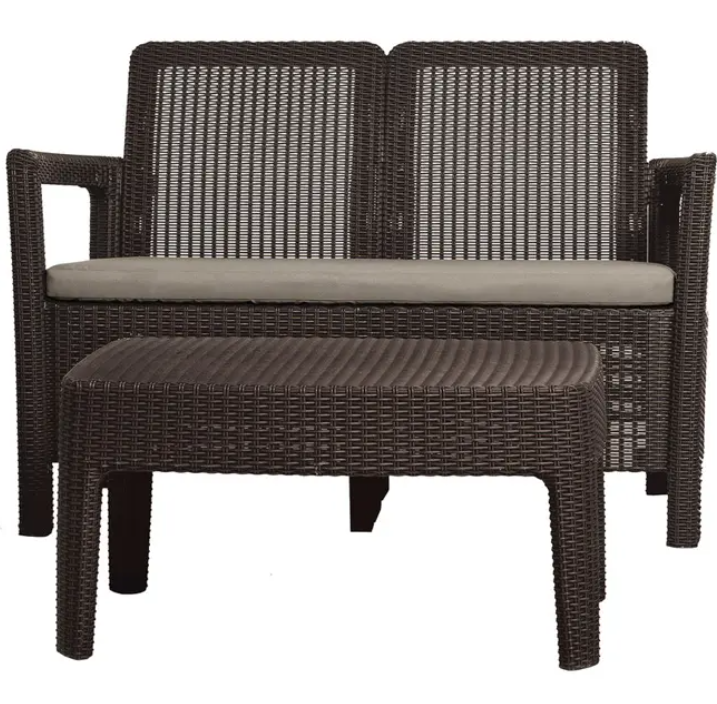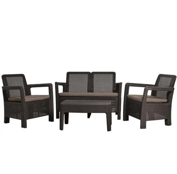 - Baštenska garnitura "Tarifa" u braon boji je set nameštaja zaobljenih ivica i teksture površine koja imitira ratan.