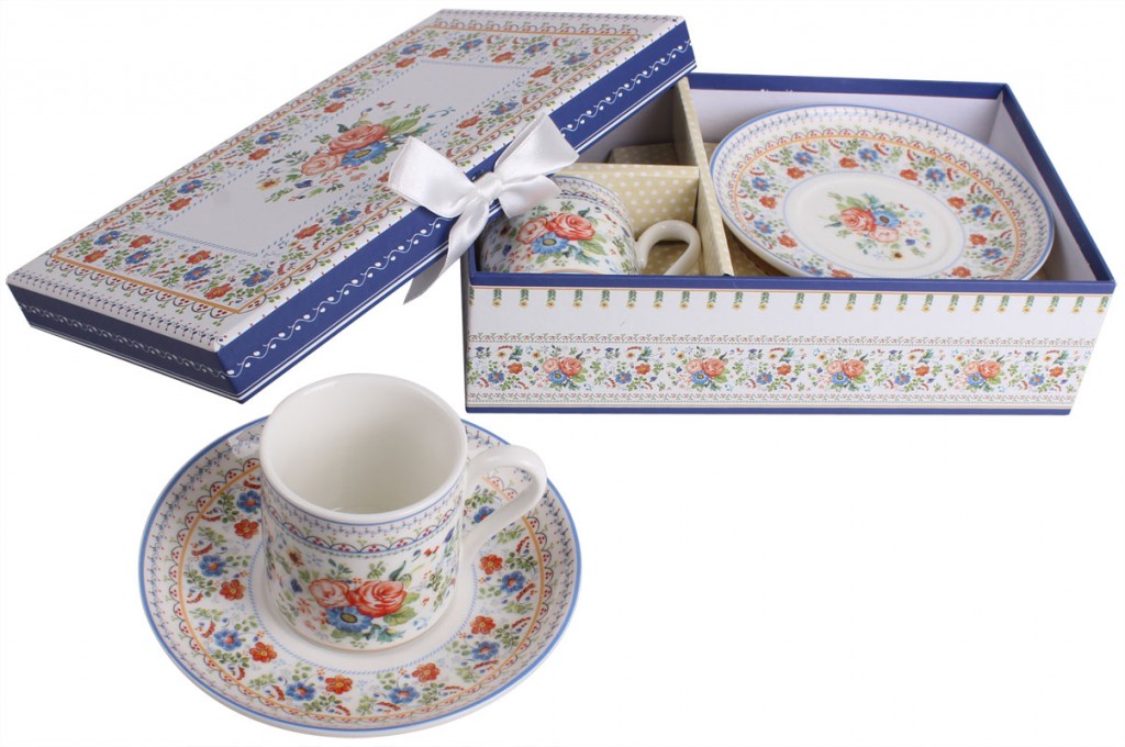 - Set od dve šoljice za kafu i dve tacnice . Upakovan u ukrasnu cvetnu kutiju sa mašnicom . Dimenzija šoljice 6x5 cm , cvetni dezen. Tacna prečnika 12,5cm . Keramika