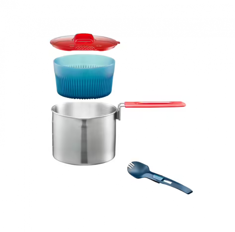 - 1 merna posuda sa 1 patentiranom sklopivom ručkom. (950 ml iskoristivo, 197 g, Ø 13,5 cm x 11 cm). 1 činija sa strukturom koja smanjuje gubitak toplote (0,45 litara iskoristivo, 13 x 6,5 cm, 46 g). 1 sklopiva kašika / viljuška (11 g, dužina: 18,5 cm). 1 poklopac / cediljka (35 g), 1 torba za prenošenje.
