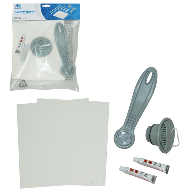 Set za popravke sadrži specijalni lepak dve bočice težine po 5g, 2 zakrpe dimenzija 18x14 cm, jedan ključ za zatezanje i jedan čep za ventil. Pogodan je za sitne popravke manjih oštećenja na bazenima na naduvavanje od vinila.
