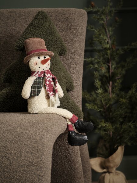 Dekorativni sneško u prljavo beloj boji, sa klasičnim šeširom i šalom, unosi toplu prazničnu atmosferu u svaki dom. Zahvaljujući visećim nogama, idealan je za postavljanje na policu, sto ili komodu.