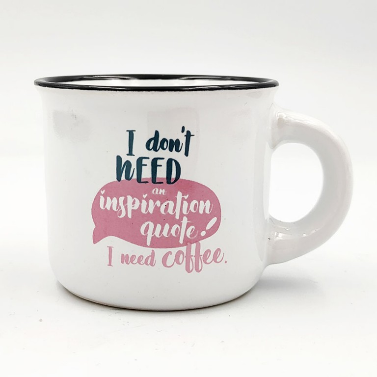 - Mala šolja za kafu, zapremine 100ml. Bele boje sa natpisom "I don`t need an inspiration quote! I need coffee". Materijal: keramika. Dimenzije:6,5 x 5,5 cm