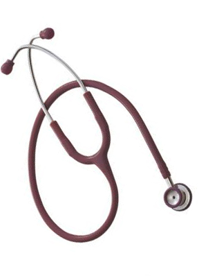 Deluks dečiji stetoskop sa dve glave u bordo boji iste boje su i slušalice, crevo i prsten na zvonu.