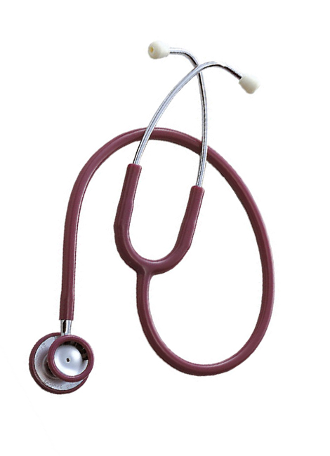 Stetoskop za pregled odraslih sa zvonom u crnoj i bordo boji creva i prstena na zvonu.