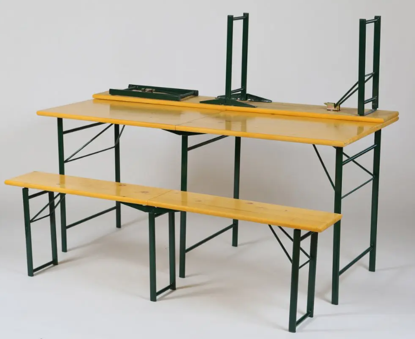 - Pivski sto sastoji se od rasklopivog stola sa dve sklopive klupe. Prirodna boja drveta smreke. Metalna konstrukcija.