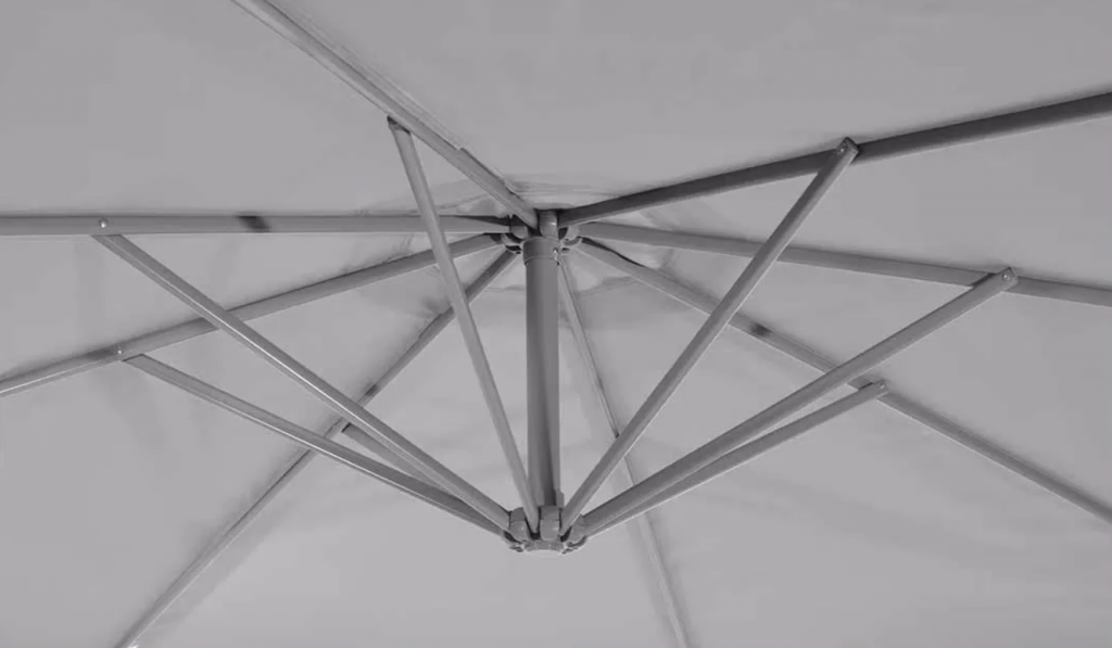 - Ovaj suncobran, dizajniran tako da, obezbeđuje maksimalnu iskorišćenost natkrivenog prostora jer se nosač nalazi izvan pokrivača.