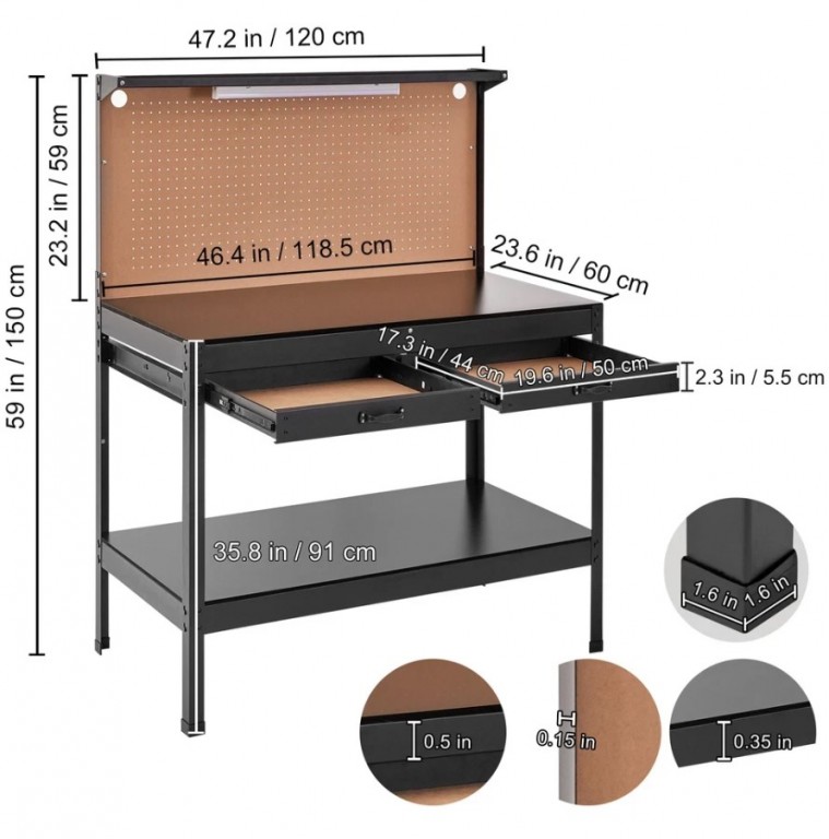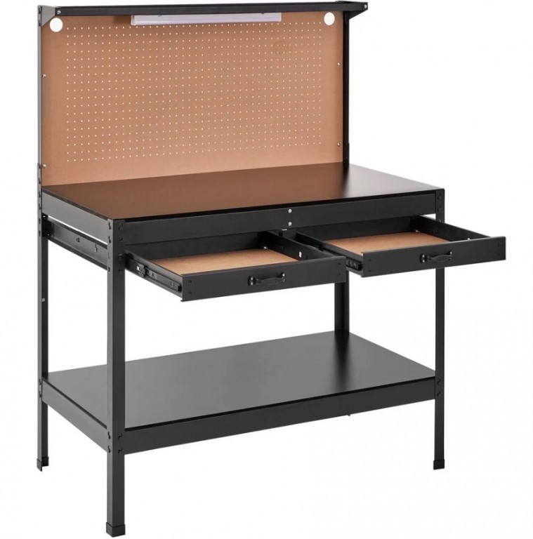 - Efikasna rešenja za skladištenje: Da bi vaši alati bili organizovani, sto budi 30 kuka za kačenje, dvostruku radnu površinu, perforiranu dasku i fioke.