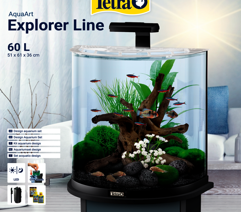 - Tetra AkuaArt Explorer linija uključuje kompletan akvarijumski set sa akvarijumom za ribe i rakove u atraktivnom dizajnu „Half Moon“. Ovo je akvarijum sa zakrivljenim prednjim staklom od 180°. Impresionira moćnim LED osvetljenjem sa maksimalnim radnim vekom od 50.000 sati i prekidačem za režim dnevnog/noćnog svetla. To ga čini idealnim za ribe, rakove i biljke. Takođe ima visokokvalitetni, providni poklopac od akrilne smole sa ugrađenim otvorom za hranjenje. Ovo omogućava da se ribe i rakovi lako hrane. Akvarijumski set takođe uključuje visokokvalitetni akvarijumski filter Tetra EasiCristal FilterBok za trajno čistu vodu. Ovo osigurava optimalne uslove života za ribe i rakove ako se hrane i visokokvalitetnom, uravnoteženom hranom. Filter se lako postavlja i odmah je spreman za upotrebu Zbog zaobljenog dizajna, akvarijum pruža veliki uvid u fascinantan podvodni svet.