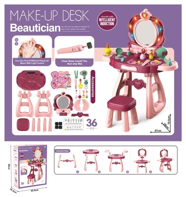 - Toaletni sto je opremljen sa svetlima oko ogledala koja stvaraju pravi efekat profesionalnog salona,a uz to dolazi i zvučnik sa 5 različitih melodija koje dodatno podstiču maštovitu igru.