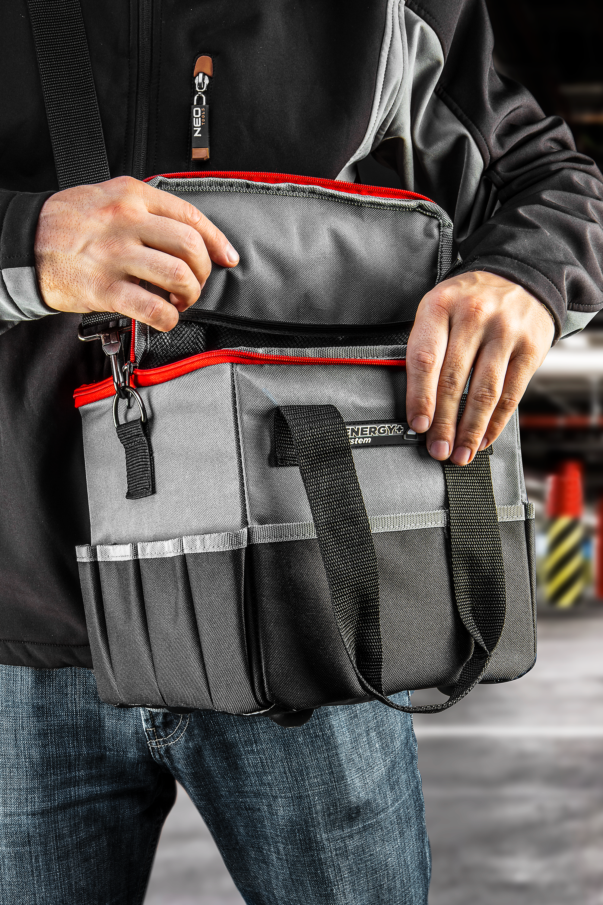 Torba ima udobnu i čvrstu ručku, kao i podesivu naramenicu sa metalnim kukama za lakše nošenje. Donji deo torbe je ojačan, vodootporan i opremljen nogicama koje štite sadržaj pri radu u težim uslovima.