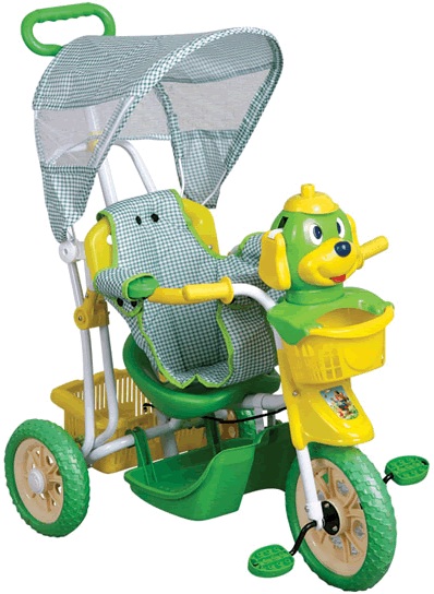 Dečiji tricikl sa suncobranom i drškom za guranje i upravljanje.