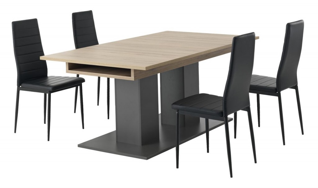 Prava kombinacija sa savremenu trpezariju. Izuzetno stabilan trpezarijski sto neobičnog dizajna. Napravljen je od iverice presvučene melaminom u boji hrasta i u sivoj boji. 1 krilo ovog stola može da se složi ispod površine stola tako da dužina stola može biti 180 odnosno 230 cm. U ovoj trpezarijskoj garnituri pored stola dobijate i 4 stolice metalne konstrukcije presvučene veštačkom kožom u crnoj boji. Dimenzije stolice su 43x96x51cm, a sedište se nalazi na visini od 44cm. Trpezarijske stolice i sto iz ove garniture možete kupiti i odvojeno