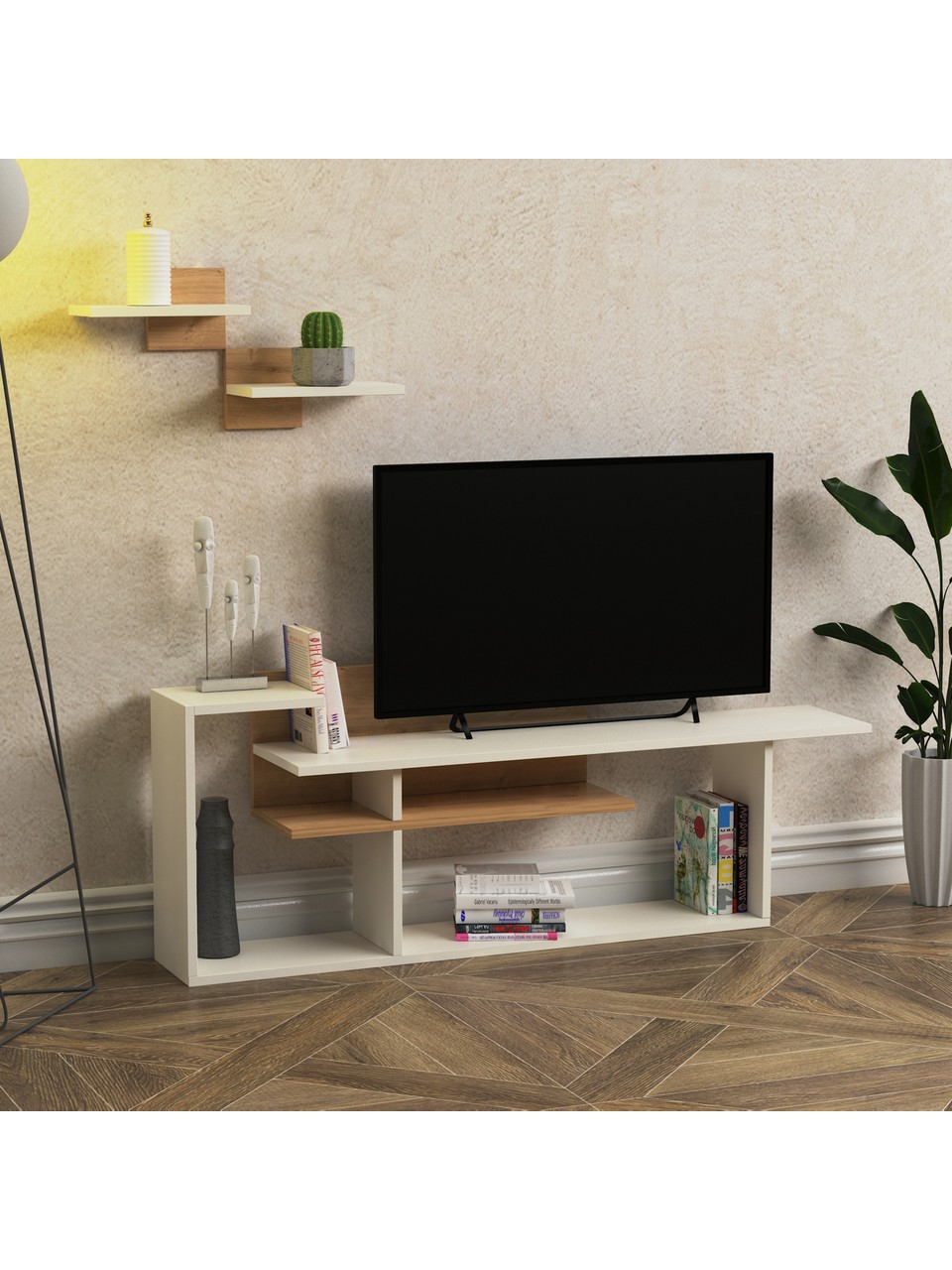 Tv komoda SN 196 * Dimenzije : Š:140 cm D:26 cm V:52 cm Tv komoda SN 196,izrađena od kvalitetnog univera 18 mm obloženog melaminskom folijom u drvnom dezenu i beloj boji,kant traka abs 0.5 mm. Elegantna i moderna komoda sa zidnom policom predstavlja upečatljiv komplet dnevnog boravka. Naši proizvodi se proizvode od sirovina sertifikovanih prema E1 standardu, koje ne sadrže kancerogene supstance i koje se pridržavaju zdravstvenih normi Evropske unije.