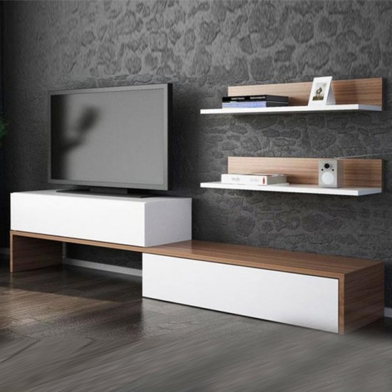 Tv komoda SN 271 * Dimenzije : Š:176/80 cm D:32/20 cm V:40/15 cm Tv komoda SN 271,izrađena od kvalitetnog univera 18 mm obloženog melaminskom folijom u drvnom dezenu i beloj boji,kant traka abs 0.5 mm. Elegantna i moderna komoda sa zidnom policom predstavlja upečatljiv komplet dnevnog boravka. Naši proizvodi se proizvode od sirovina sertifikovanih prema E1 standardu, koje ne sadrže kancerogene supstance i koje se pridržavaju zdravstvenih normi Evropske unije.