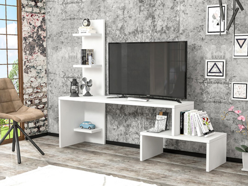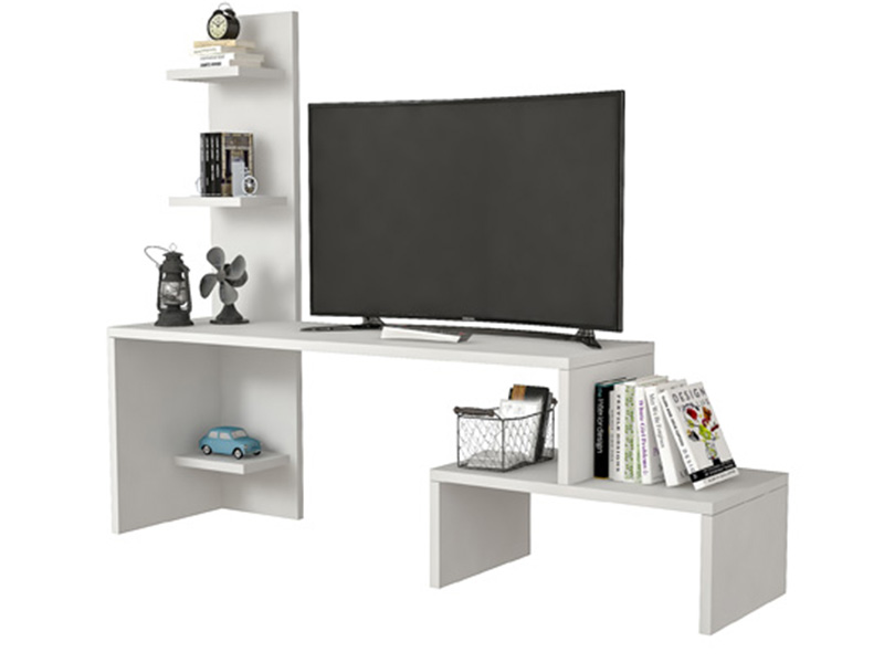 Tv komoda Zumbul belo * Dimenzije : Š:124 cm D:30 cm V:100 cm Tv komoda Zumbul belo izrađena je od ploča visokokvalitenog univera 18 mm oplemenjenog melaminskom folijom u beloj boji,abs traka na ivicama. Neobičan oblik police podseća na cvetne izdanke,raštrkano i neravnomerno. Svojom estetikom i formom ova komoda ulepšaće prostor koji joj je namenjen. Korišćeni materijal ima ISO 9001 i FSC sertifikate,u okviru E1 standarda ne sadrži kancerogene supstance.