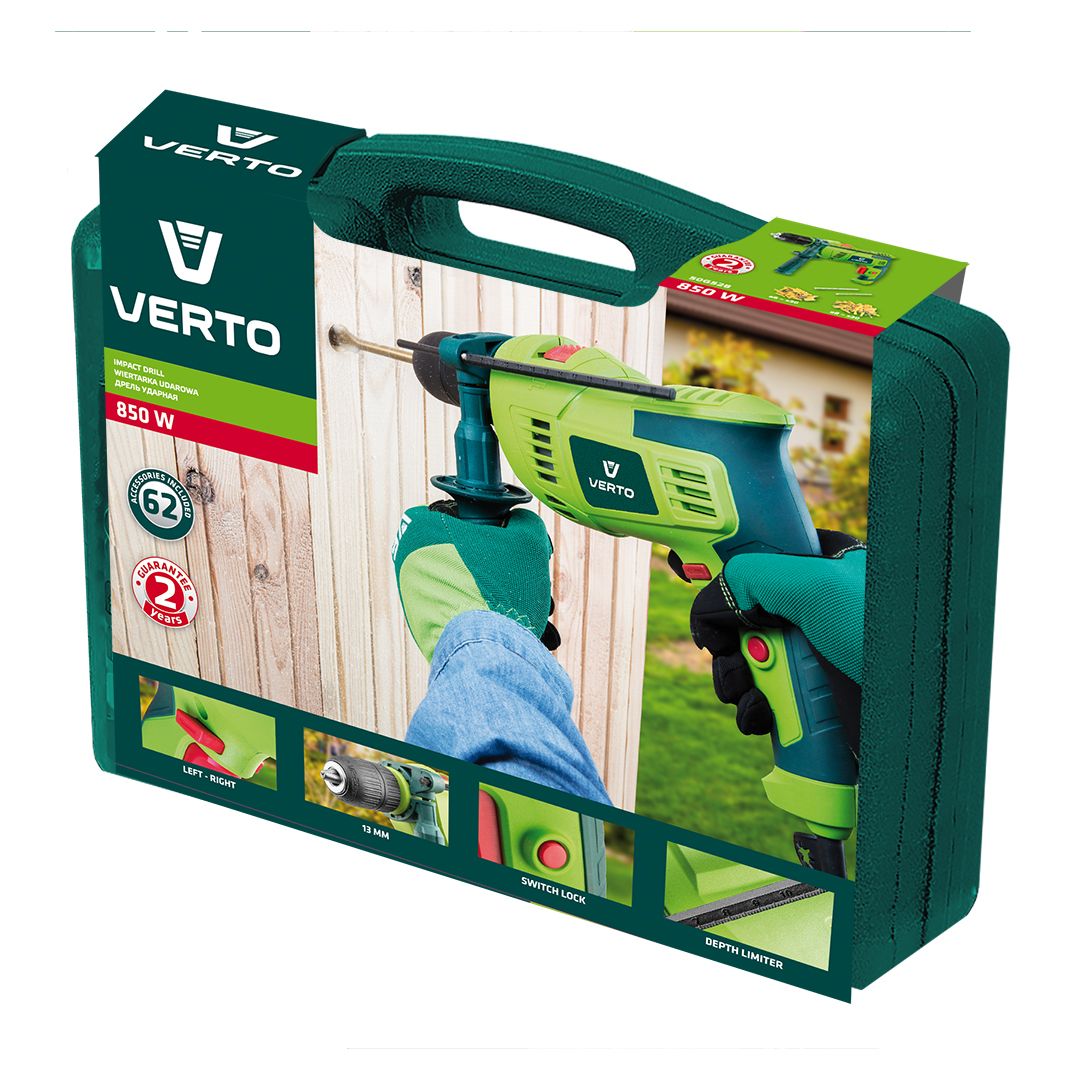VERTO 850 W udarna bušilica sa brzom steznom steznom glavom od 13 mm. Sadrži funkcije bušenja i udarnog bušenja. Snaga od 850 W omogućava bušenje rupa prečnika do 30 mm u drvetu, 13 mm u betonu i 13 mm u čeliku. Svrdlo ima prekidač za biranje smera desno / levo, podešavanje brzine koraka, neprekidnu blokadu rada. Opremljen je dugim kablom za napajanje za slobodan rad alata. Ergonomska drška poboljšava udobnost i sigurnost na radu. Alat se isporučuje sa dodatnom bočnom drškom i štapom za merenje dubine bušenja.
