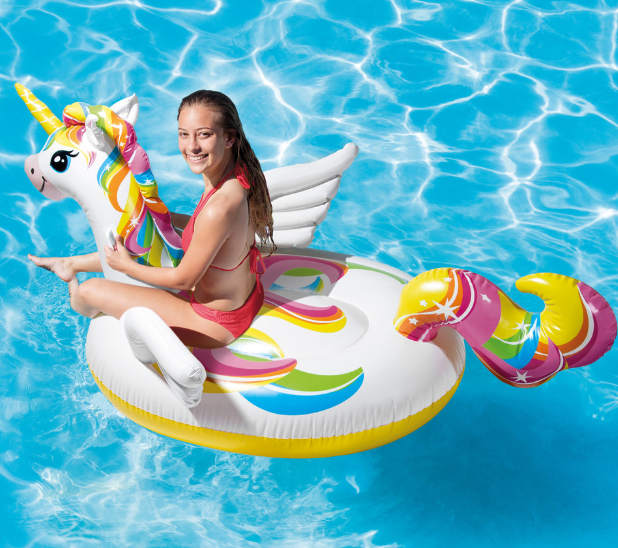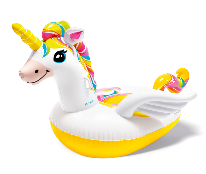 - INTEX Unicorn Pool Floater je veliki i atraktivan napuhavajući dušek za bazen u obliku jednoroga, dimenzija 78" x 55" x 40" (približno 198 cm x 140 cm x 102 cm). Ovaj dušek je idealan za decu i odrasle koji žele da uživaju u opuštanju na vodi, uz zabavan i šaren dizajn.
