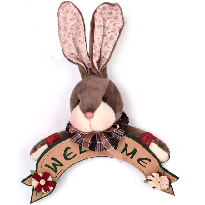 - Plišani ukras za vrata, sivi zeka sa natpisom “WELCOME”. 2 kombinacije boja, zelena i crvena. Dečko zeka sa zelenom leptir mašnom I Devojčica sa rozikastom mašnicom. Visina 28cm.