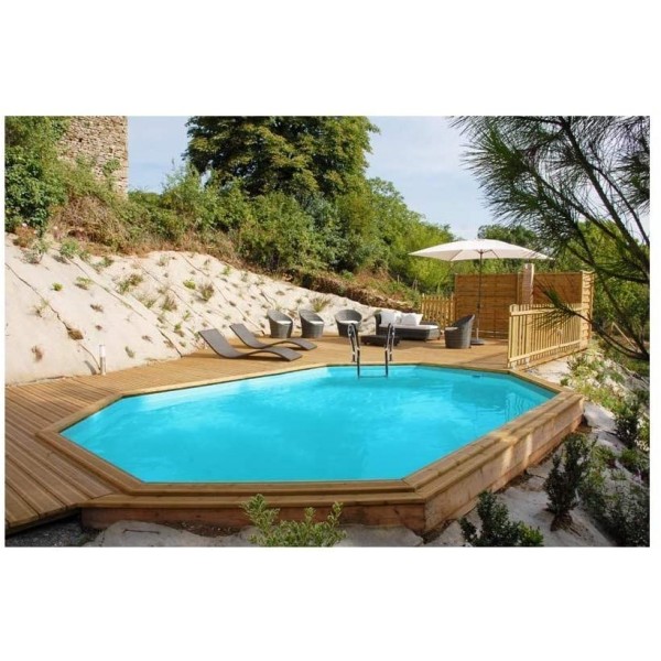 - -oprema :plava PVC obloga sa anti UV tretmanom, drvena konstrukcija ,filterset od 8m3/h + 85 kg peska ,drvene spoljne stepenice i unutrasnej stepenice od ne rdjajuceg celika , stitinici za dno i zid bazena, 1 skimer, prikljucna creva .