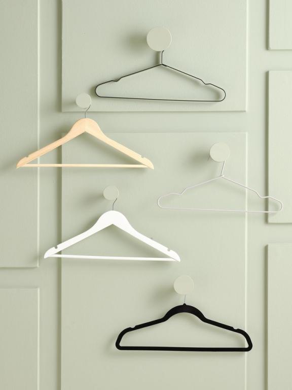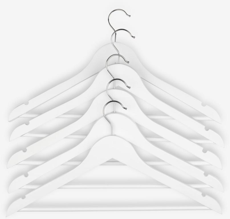 Pakovanje od 5 belih klasičnih vešalica od drveta i čelika. Sa urezima za odeću na bretele, kaiševe i sl. Dizajnirane isključivo za suvu odeću.