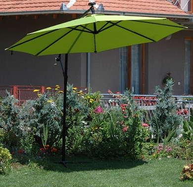 Suncobran poseduje solarnu ćeliju na krovu koja pomoću sunčeve energije puni baterije, one napajaju energijom LED sijalice. Kako je suncobran konstantno izložen sunčevom zračenju baterije će se svakodnevno puniti, a sijalice svetleti kada mrak padne. Viseći tzv. Banana suncobrani, dizajnirani su tako da, obezbede maksimalnu iskorišćenost natkrivenog prostora jer se nosač nalazi izvan pokrivača. Možete ih koristiti uvek kada vam treba zaštita od sunca. Postolje se sastoji iz dve ukrštene metalne profilisane poluge koje poseduju otvore za učvršćivanje šrafovima za podlogu. Postolje je potrebno dodatno učvrstiti.