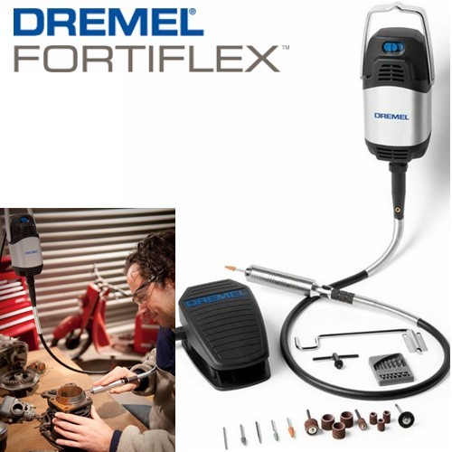 Dremel Fortiflex je visoko kvalitetni alat za preciznost, koji se sastoji od moćnog visećeg motora (300 W), patentirane otporne fleksibilne osovine, zamenljivog ručnog uređaja za preciznost i nožne pedale za kontrolu promenljive brzine (0 – 20000 obr./min.). Ovo ga čini idealnim alatom za stacionarne projekte, kao što je obrada drveta, pravljenje nakita, obrada kamena, popravka automobila, ili bilo koji projekat koji zahteva kombinaciju snage i preciznosti. Dremel Fortiflex: snaga i preciznost.