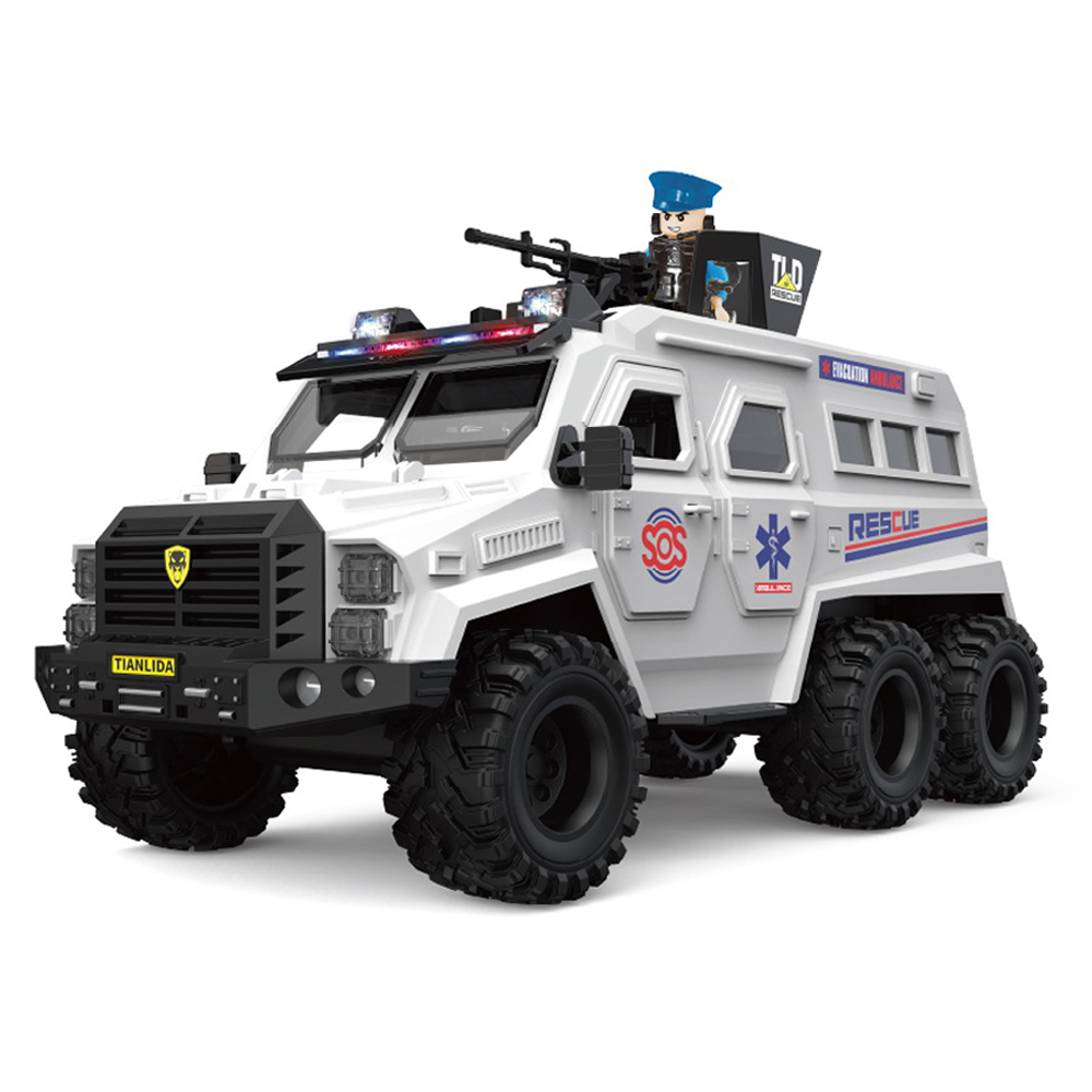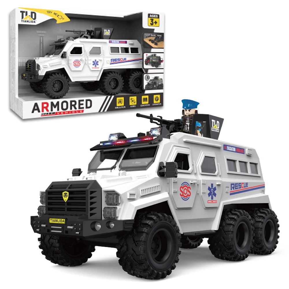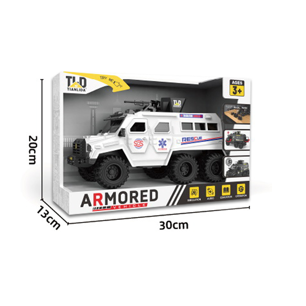 Vojno oklopno belo vozilo predstavlja detaljno izrađen model specijalnog terenskog vozila sa vojnim dizajnom. Vozilo ima čvrstu konstrukciju, izražene terenske gume i šest točkova koji omogućavaju stabilno kretanje po različitim podlogama. Na krovu se nalazi rotirajući top sa figurom vojnika, što dodatno doprinosi realističnom izgledu i igri. Model poseduje svetlosne i zvučne efekte koji se aktiviraju pritiskom na dugme, čineći igru dinamičnijom i zanimljivijom. Vozilo funkcioniše po principu inercije, dovoljno je pogurati ga unapred i nastaviće da se kreće bez upotrebe baterija za vožnju