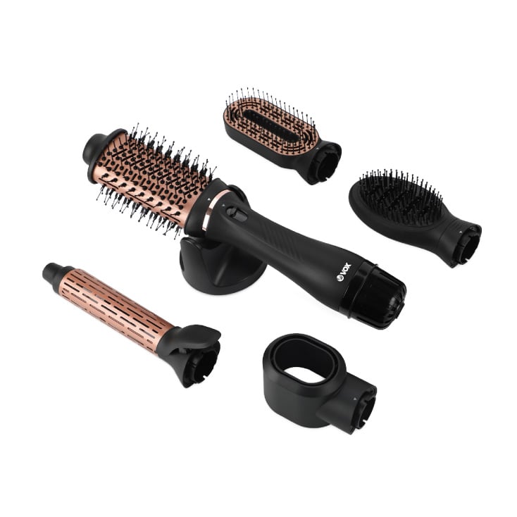 Opremljen sa pet nastavaka u jednom – koncentratorom za brzo sušenje, okruglom četkom za volumen, nežnom četkom za ravnanje, klasičnom četkom za oblikovanje i nastavkom za lokne (figaro)